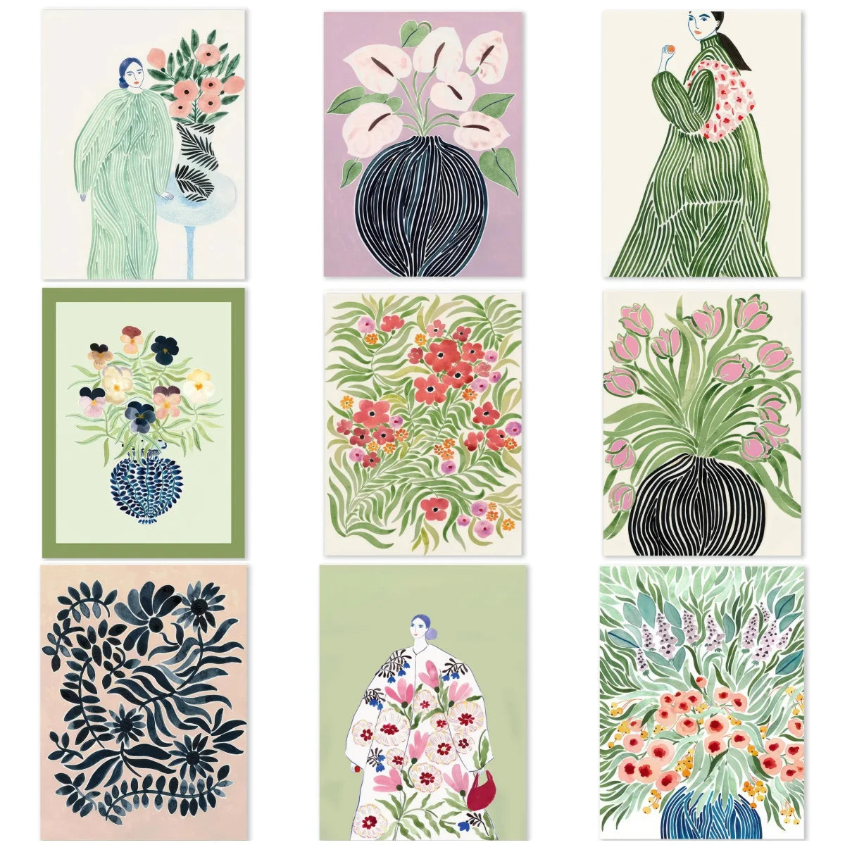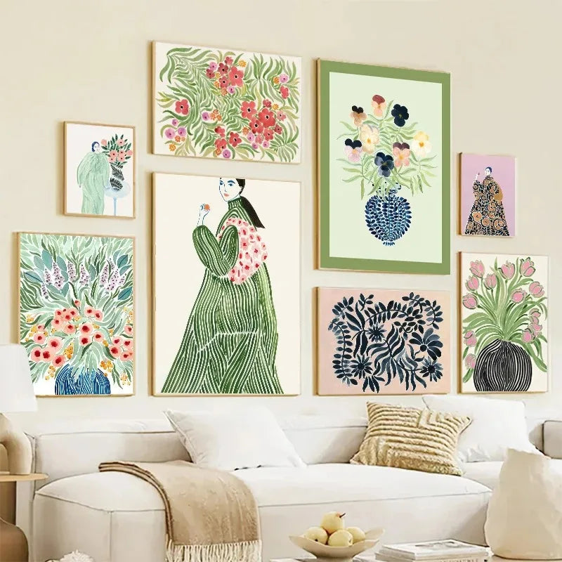 A delicate abstract canvas print featuring tulips and violets arranged in a vase, complemented by the silhouette of a woman wearing a coat. Soft light green tones create a calming and elegant atmosphere, perfect for modern living room décor.