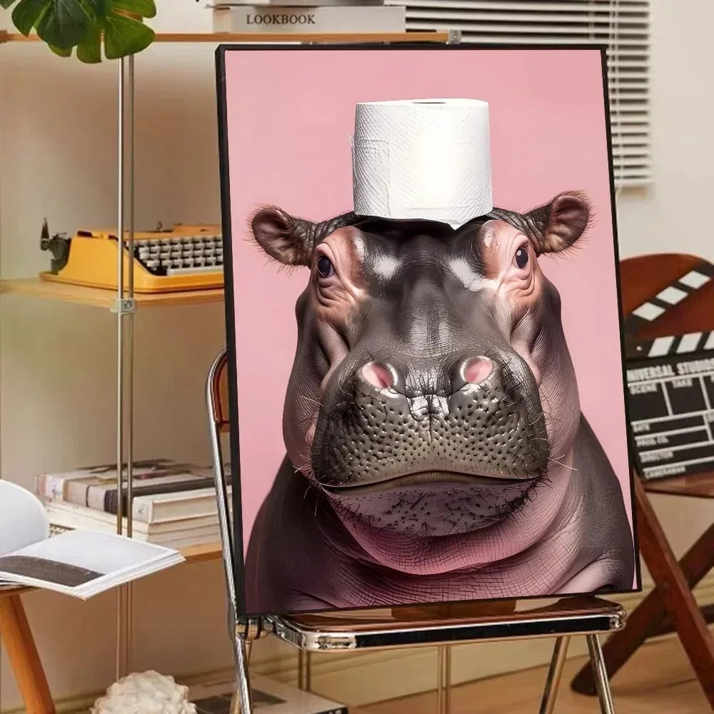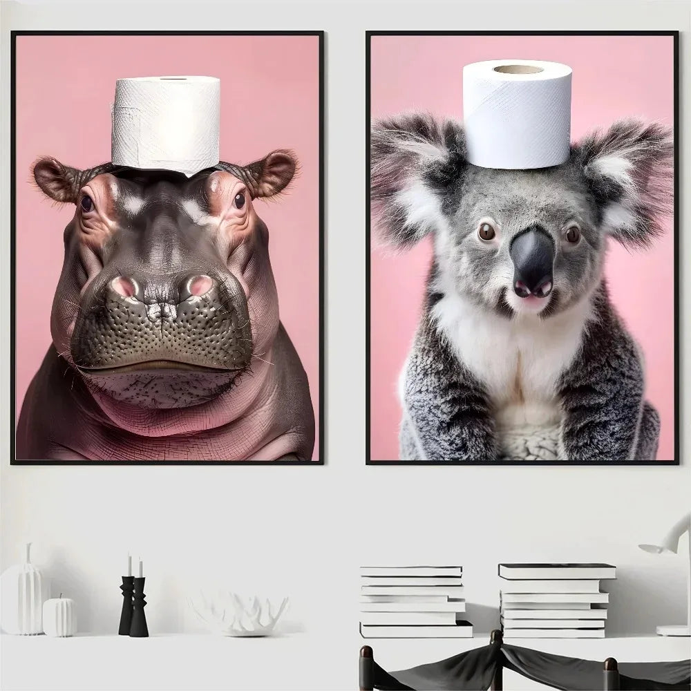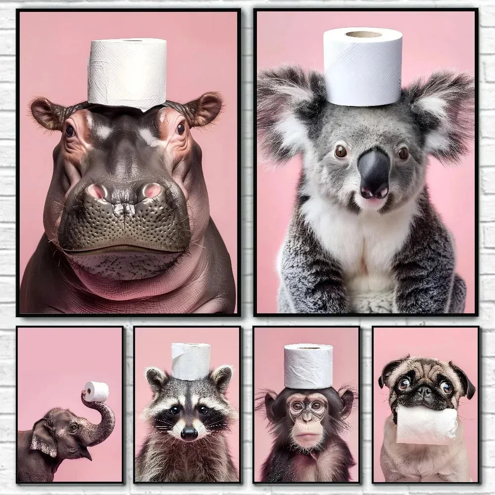 A playful canvas print featuring cute animals interacting with toilet paper, perfect for adding humor and charm to your living room, bedroom, entrance, or café. This fun and whimsical artwork is a lighthearted addition to any space.