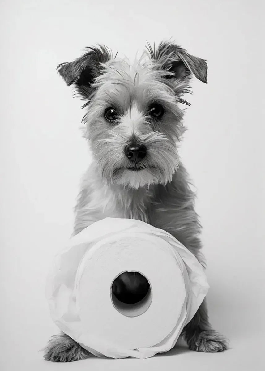 A humorous black-and-white canvas featuring an otter, hedgehog, and giraffe in cheeky bathroom poses with toilet paper. Light-hearted decor for bathrooms and guest toilets.