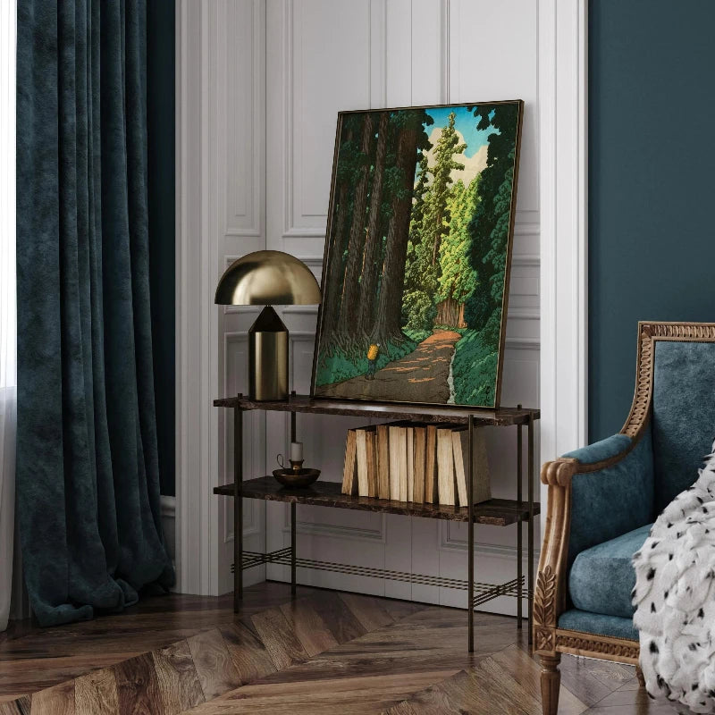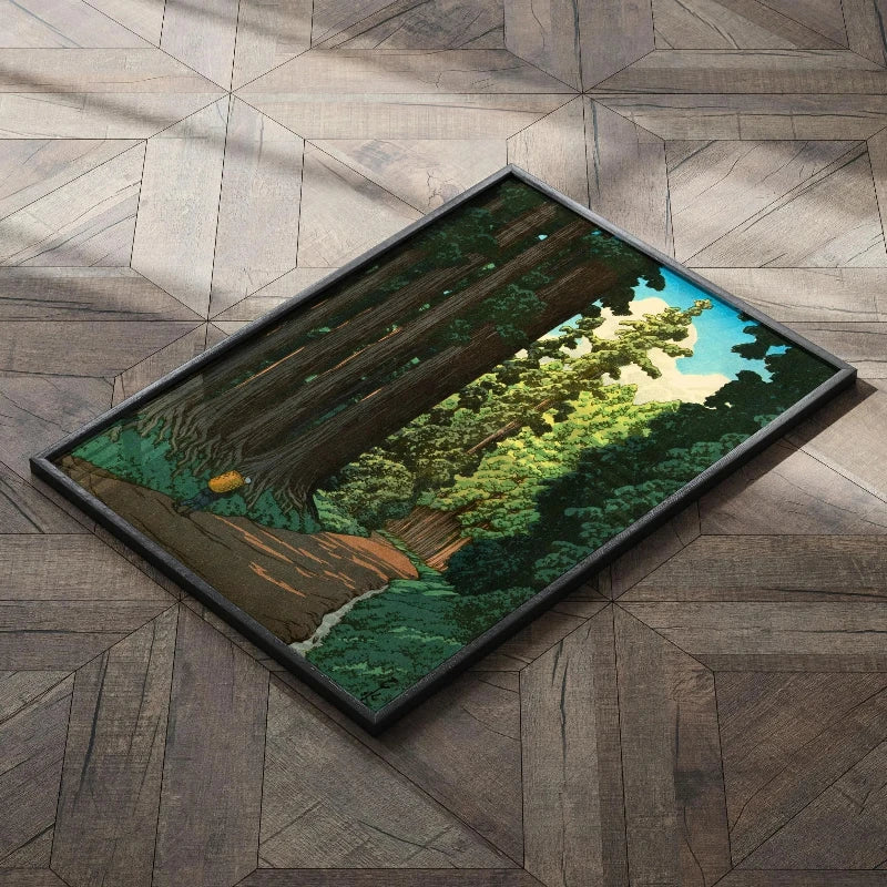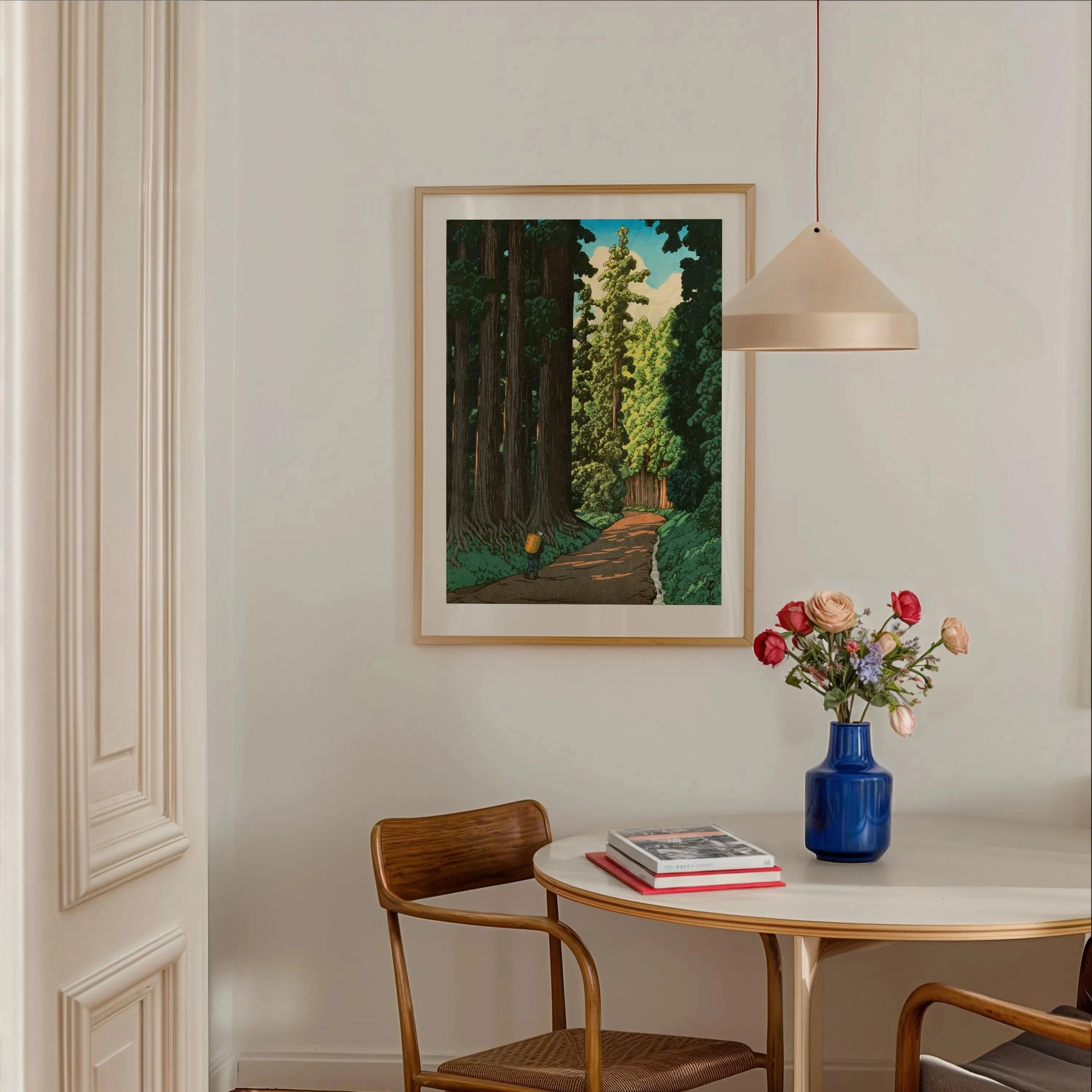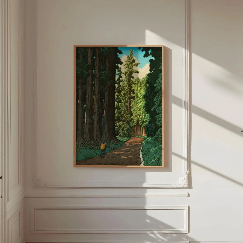 “Road to Nikko” by Kawase Hasui captures the quiet beauty of Japan’s countryside with a gently curving road leading through towering cedar trees into soft, sunlit distance. The deep greens, textured foliage, and warm patches of light create a peaceful rhythm, while the small figure on the path adds a subtle sense of journey and scale. A classic example of Japanese shin-hanga atmosphere - calm, contemplative, and timeless - this print is ideal for Japandi, minimalist, or nature-inspired interiors in living rooms, bedrooms, offices, or reading nooks.
