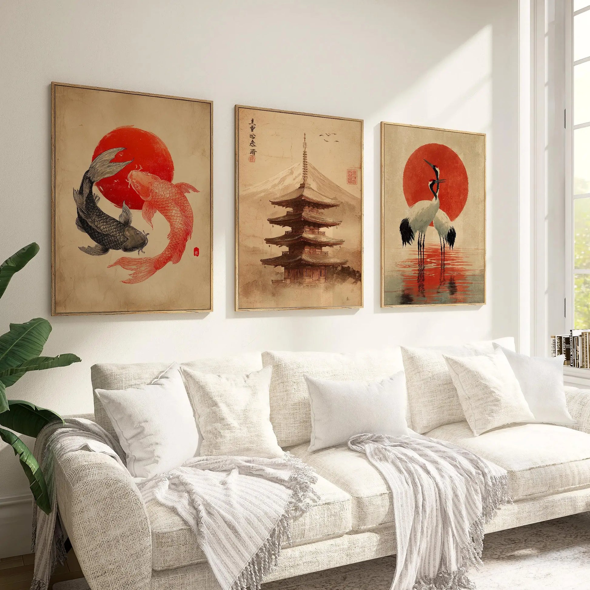 Bring a calm, balanced feel to your space with this cohesive set of three Japanese-inspired art prints. The first print shows two koi fish circling beneath a bold red sun, a symbol of harmony and perseverance. The second features a traditional pagoda rising in soft, vintage tones for a peaceful, timeless look. The third print captures elegant cranes standing in reflective water before a striking red sun, representing longevity and good fortune. With warm neutrals, subtle texture, and classic brush-style details, this triptych is ideal for living rooms, bedrooms, hallways, or meditation spaces.