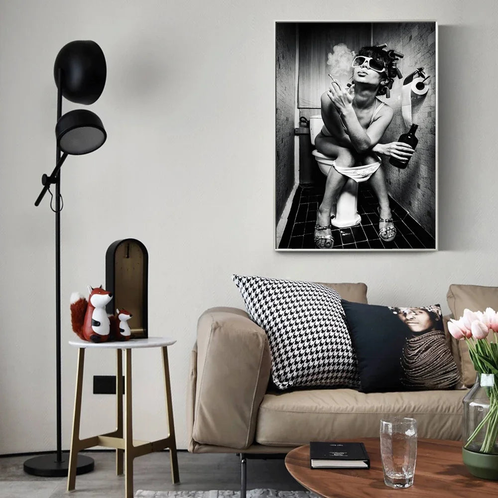 A bold black and white pop art canvas print featuring a sexy woman on a toilet and another woman with a cigarette. This edgy artwork adds a modern and provocative touch to your home décor or gallery wall.